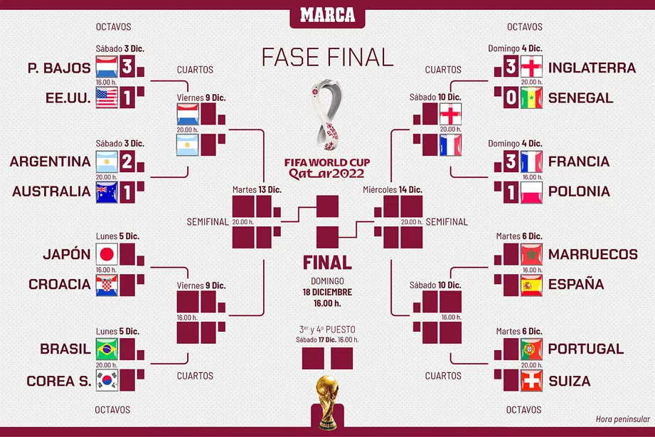 Los actavos de final está llegando a su fin, aún faltan los enfrentamientos de: Japón vs Croacia, Brasil vs Korea del Sur (5 de diciembre), Marruecos vs España y Portugal vs Suiza (6 de diciembre), Las selecciones que ya consiguieron su boleto para los cuartos son: Países Bajos vs Argentina (9 de ciembre) e Inglaterra vs Francia (10 de diciembre). Estos partidos prometen ser muy interesantes porque son selecciones con amplia trayectoria y prestigio en el fútbol.