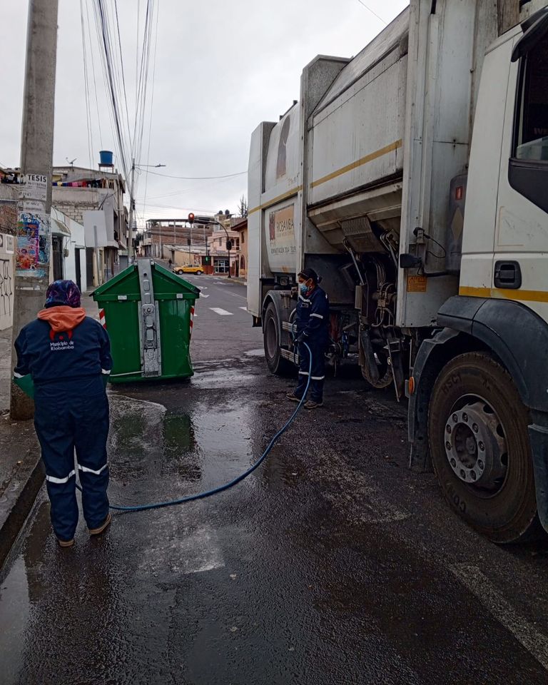 Aprovechando el bajo tráfico vehículo para hacer el lavado de contenedores y baldeo alrededor.