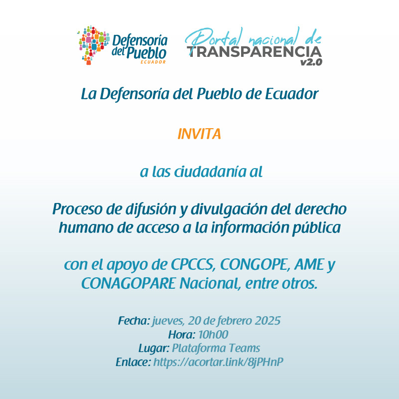 Jueves, 20 de febrero 2025 de 10h00 a 12h30 Proceso de difusión y divulgación del derecho humano de acceso a la información pública, dirigido a la ciudadanía a la que prestan servicios los sujetos obligados públicos y privados; veedurías, observatorios, comités de personas usuarias, líderes y lideresas comunitarias, organizaciones sociales, defensoras y defensores de derechos humanos y de la naturaleza, estudiantes, personas de la sociedad civil en general.