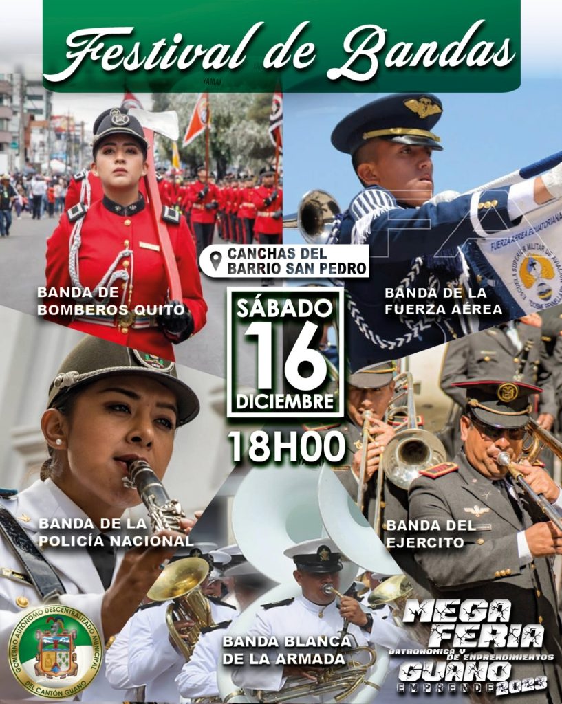Por los 178 años de cantonización, la Mega Feria de Emprendimientos, el sábado 16 de diciembre presenta el I Festival de Bandas Uniformadas del Cuerpo de Bomberos de Quito, Fuerza Aérea Ecuatoriana, Policía Nacional, Ejército Ecuatoriano, Banda Blanca de la Armada Nacional.