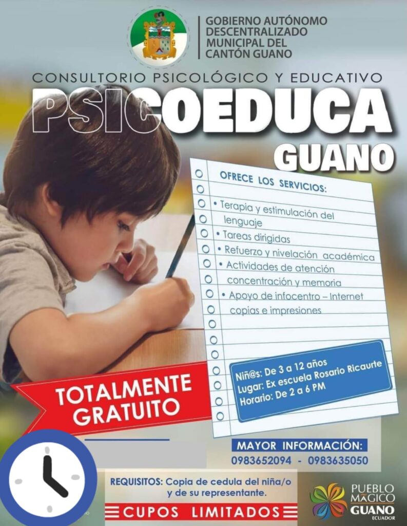 Psicoeduca de Guano continúa trabajando apoyando a la niñez guaneña, ¡puedes ser parte de este proyecto! acude a las instalaciones del DELLS en la ex escuela Rosario Ricaurte y elige uno de estos servicios: Terapia y estimulación del lenguaje, tareas dirigidas, refuerzo y nivelación académica, actividades de atención, concentración y memoria, apoyo de infocentro – internet, copias o impresiones