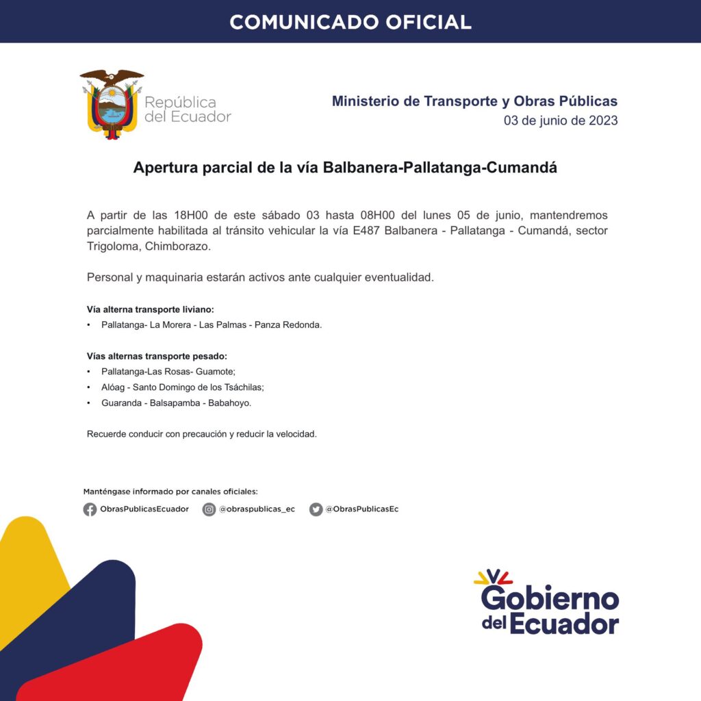 Habilitamos parcialmente la vía Balbanera – Pallatanga – Cumandá, sector Trigoloma, para vehículos livianos. Vías alternas para transporte pesado:
