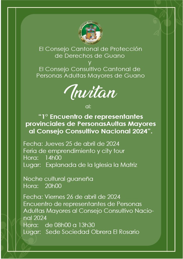 El GADM-CG, Consejo Cantonal de Protección de Derechos, Consejo Consultivo de Personas Adultas Mayores y la Asociación Nuevos Horizontes de la Vida en articulación con el CNII/Consejo Nacional para la Igualdad Intergeneracional; invitan a participar en el I ENCUENTRO DE REPRESENTANTES PROVINCIALES DE PERSONAS ADULTAS MAYORES AL CONSEJO NACIONAL 2024