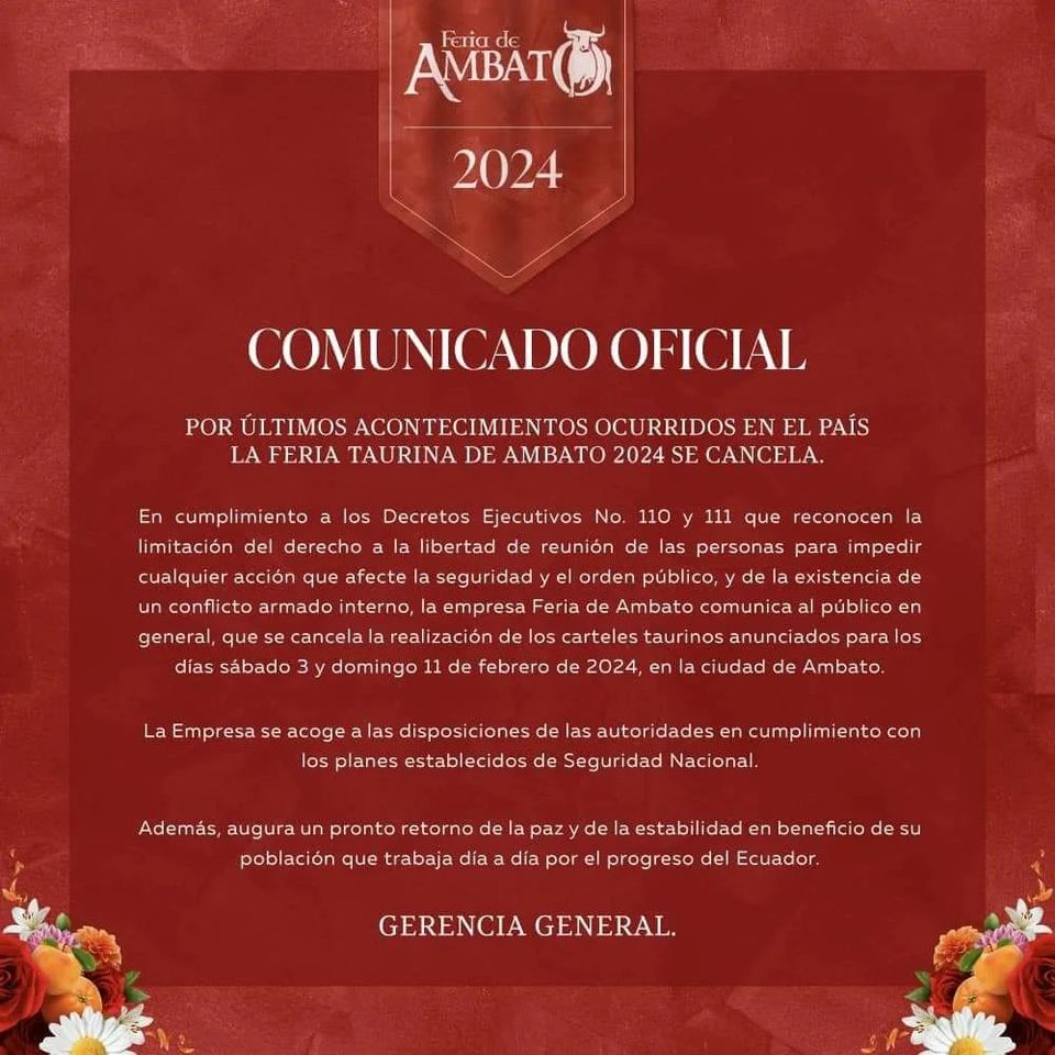 La Empresa organizadora del evento emitió un comunicado en sus redes este jueves, 11 de enero de 2024.Además, agradece profundamente el apoyo de la afición y la excelente acogida que han tenido nuestros carteles