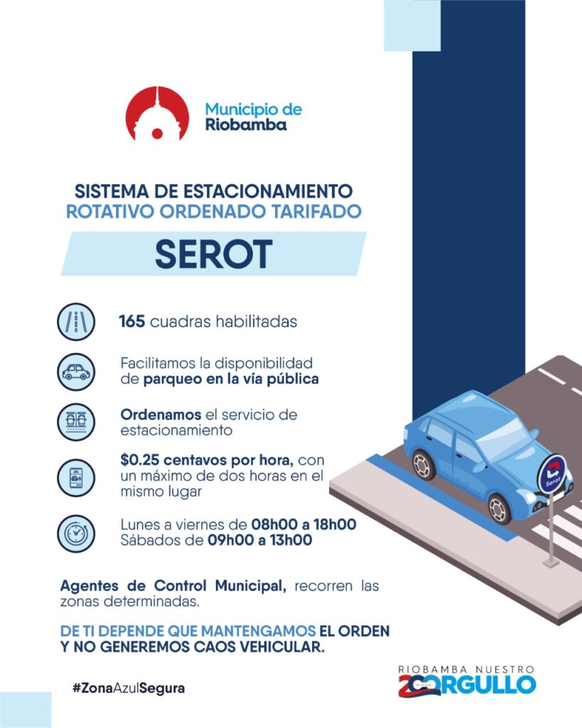 Dicha Ordenanza establece que al momento de hacer uso de este sistema estacionando el vehículo, el tiempo será máximo de dos horas, el usuario deberá adquirir la tarjeta prepago (SEROT) la que autoriza el uso del espacio público en la vía, la misma que tiene un valor 25 centavos de dólar la hora. Hay que tener en cuenta que cada tarjeta prepago “SEROT” otorga el derecho de 5 minutos de gracias una vez concluido la hora por el servicio de estacionamiento.