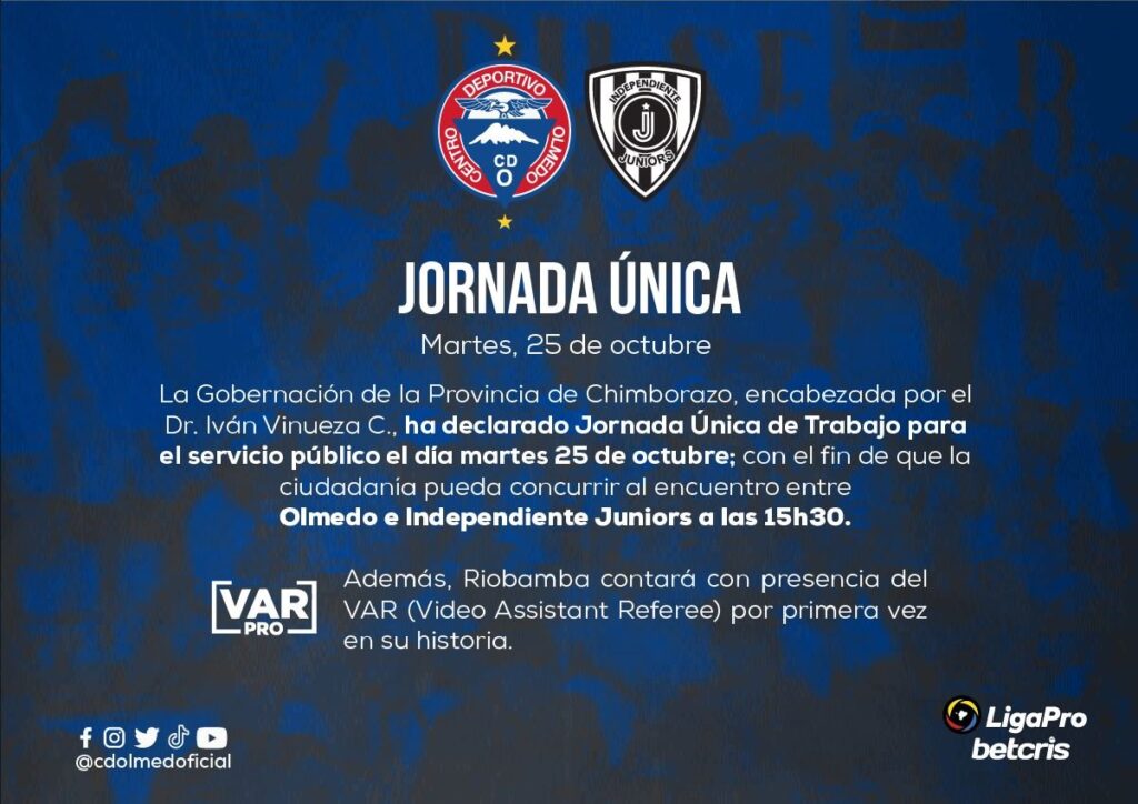 A través de la Gobernación de Chimborazo dieron a conocer que se dispone para este martes, el horario de 7y 30 hasta las 15:30 , con el fin de que la ciudadanía pueda concurrir al estadio a observar el encuentro deportivo entre el C D Olmedo contra el Independiente Juniors.
