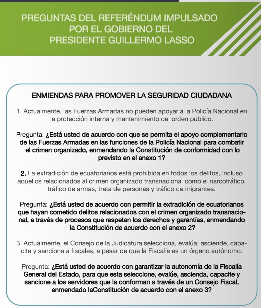 El 05 de febrero los ciudadanos recibiremos una papeleta en la que debemos marcar SI o NO a las preguntas sobre diversos ejes q el Presidente Guillermo Lasso propone.