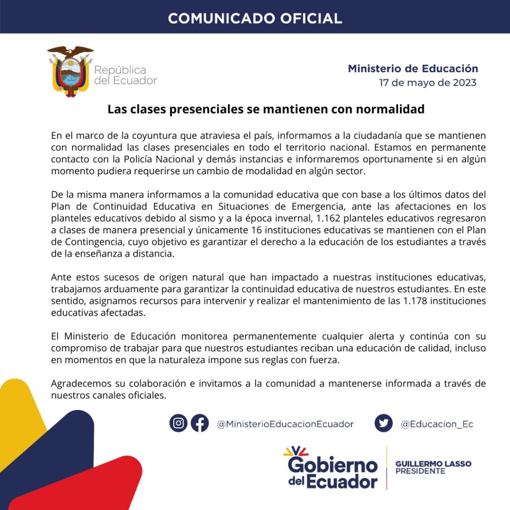Debido a la crisis política que atraviesa el país es necesario informar que las clases se mantienen con normalidad en el país.